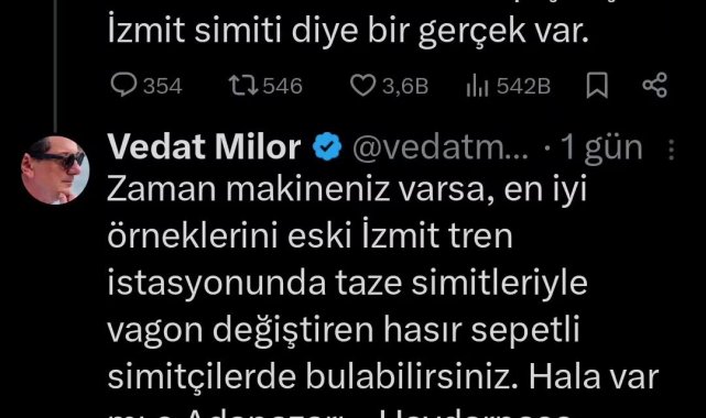 Vedat Milor, tartışmaların ardından nostaljik bir anısını da paylaştı. Milor, "En iyi örneklerini eski İzmit tren istasyonunda taze simitleriyle vagon değiştiren hasır sepetli simitçilerde bulabilirsiniz. Hâlâ var mı o Adapazarı - Haydarpaşa trenleri?" sözleriyle İzmit simidinin geçmişine vurgu yaptı.