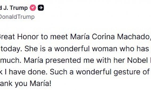 ABD Başkanı Donald Trump ise kendisine ait Truth sosyal medya platformundan yaptığı paylaşımda Machado'nun jestini doğrulayarak, "Bugün Venezuela'dan Maria Corina Machado ile tanışmak benim için büyük bir onurdu. Çok şey yaşamış harika bir kadın. Maria, yaptığım çalışmalar nedeniyle bana Nobel Barış Ödülü'nü takdim etti. Karşılıklı saygının harika bir göstergesi. Teşekkür ederim Maria!" ifadelerini kullandı.