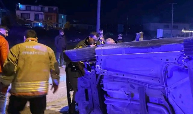 Hatay'ın Defne ilçesinde vidanjöre çarparak takla atan ve yan yatan otomobilin sürücü yaralandı.