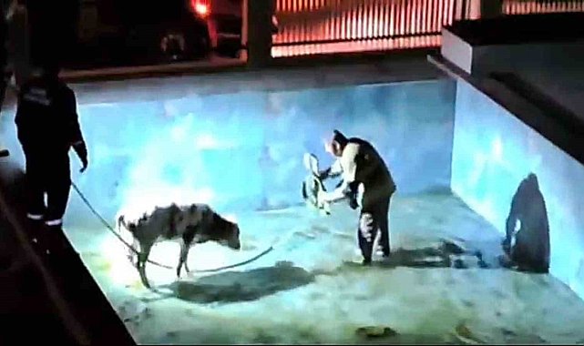 Olay, önceki akşam Çandarlı Mahallesi'nde meydana geldi. İnaşaat halindeki bir villanın boş olan havuzunda buzağı olduğunu farkeden vatandaşlar, durumu itfaiyeye bildirdi. Havuz içerisinde dolanarak çaresiz bekleyen buzağı için itfaye görevlileri bölgeye geldi. Bir görevli havuz içerisinde, diğer ekip üyeleri havuz dışında dakikalarca buzağıyı kurtarmaya çalıştı. İtfaiye erlerine zor anlar yaşatan sevimli buzağı, uzun uğraşlar sonucu gövdesinden yukarı çekilerek havuzdan çıkarıldı. Buzağı daha sonra sahibine teslim edildi.