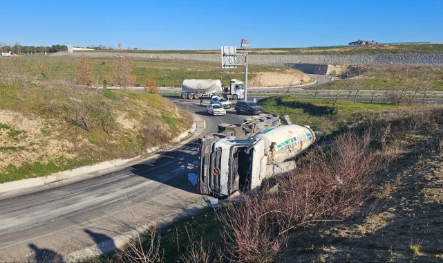 Tekirdağ'ın Çerkezköy ilçesinde çevre yolunda meydana gelen kazada, virajı alamayan beton mikseri yan yatarak devrildi. Kazada araç sürücüsü yaralanırken beton yola döküldü.