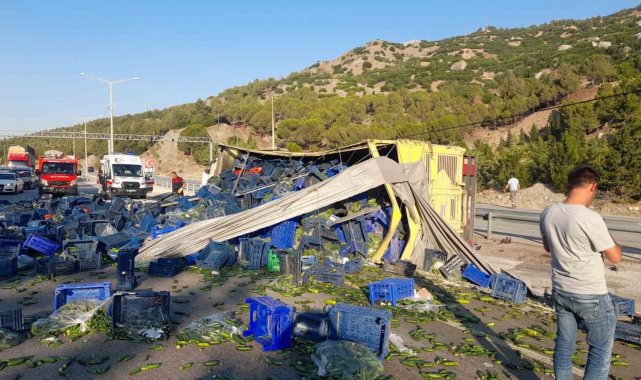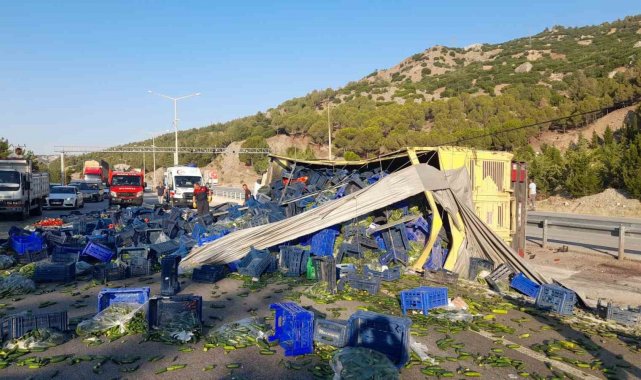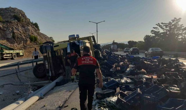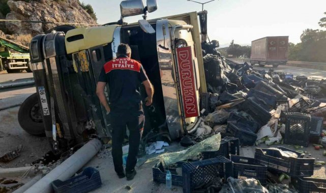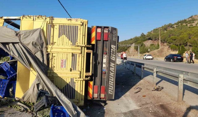 Virajı alamayan sebze yüklü kamyon refüje devrildi: 1 yaralı