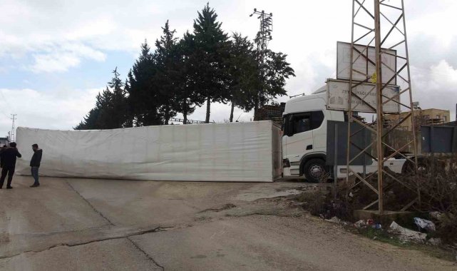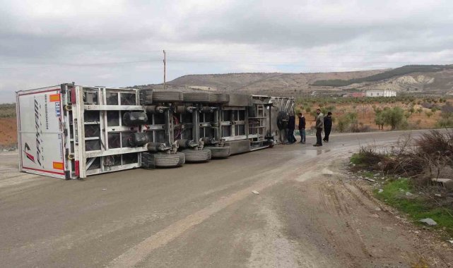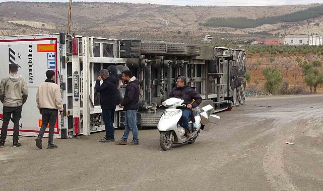 Kilis'te Duruca köyü yolu üzerinde virajı alamayan tır yan yattı. Kazada yaralanan olmazken, olayla ilgili inceleme başlatıldı.