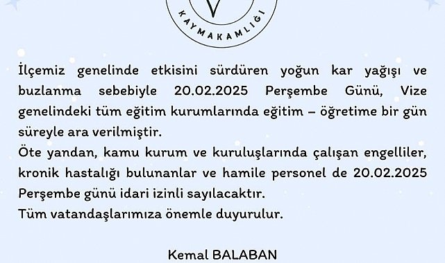 Vize Kaymakamlığı'ndan yapılan açıklamada, "İlçemiz genelinde etkisini sürdüren yoğun kar yağışı ve buzlanma sebebiyle 20 Şubat 2025 Perşembe günü, ilçe genelindeki tüm eğitim kurumlarında eğitim - öğretime bir gün süreyle ara verilmiştir. Öte yandan, kamu kurum ve kuruluşlarida çalışan engelliler, kronik hastalığı bulunanlar ve hamile personel de idari izinli sayılacaktır. Tüm vatandaşlarımıza önemle duyurulur" ifadelerine yer verildi.