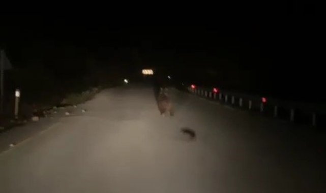 Karabük'te yaban domuzu ile yolda koşan ayı cep telefonu kamerasınca görüntülendi.