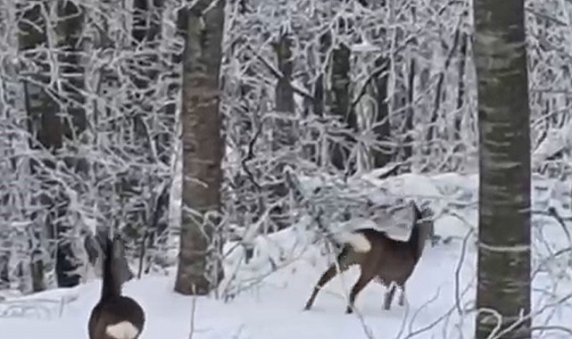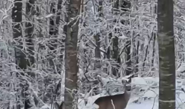 İlçe genelinde etkili olan kar yağışı ve soğuk hava, yaban hayatını da olumsuz etkiledi. Bölgede yaşayan bir vatandaş, yiyecek bulmakta zorlanan hayvanları beslemek amacıyla aracıyla yüksek kesimlere çıktı. Ormanlık alana yem bıraktığı sırada iki geyikle karşılaşan vatandaş, o anları cep telefonu kamerasıyla kaydetti.