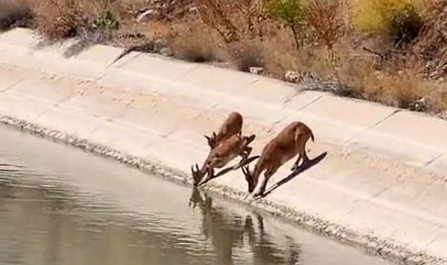 Yaban keçileri sulama kanalında su içerken görüntülendi