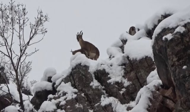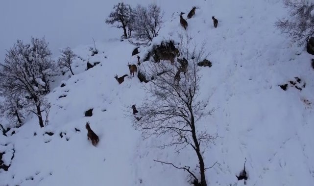 Kar nedeniyle zaman zaman karayollarına kadar inen yaban keçileri, kırsal bölgelerde yer alan maden ocaklarının yakınlarına kadar geliyor. Onlarca yaban keçisi sürüsü kar üzerindeki yolculuğu dron ile görüntülendi.