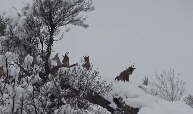 Adıyaman'da etkili olan kar yağışı yaban hayatını da olumsuz etkiliyor. Yaban keçileri yiyecek bulabilmek için sürüler halinde kar olmayan yerlere iniyor.
