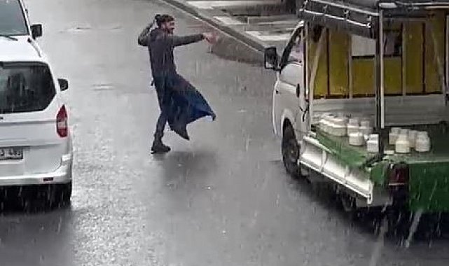 Arnavutköy'de kar yağışı etkili oldu. Yağan kara aldırış etmeyen bir seyyar satıcı da aracından müzik açarak sokak ortasında oynadı.