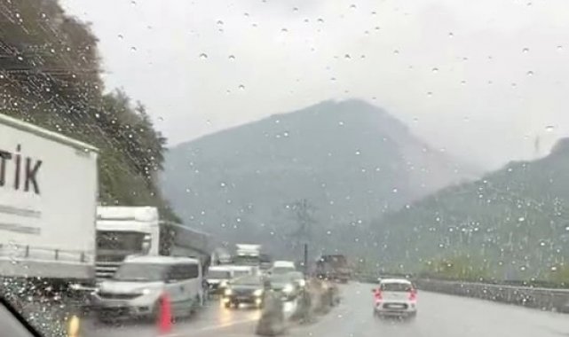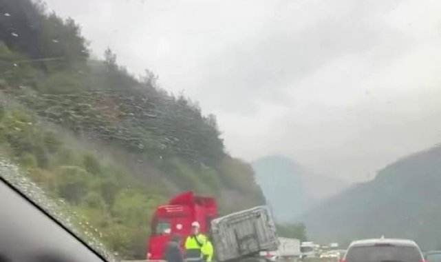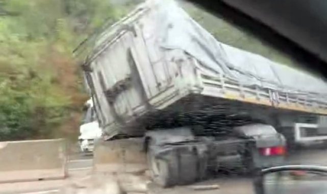 Sakarya'nın Geyve ilçesi D-650 kara yolunda yağışın etkisi ile sürücüsünün kontrolünden çıkan tır, orta refüje çarparak makasladı. Kaza sebebi ile bölgede uzun araç kuyrukları oluştu.