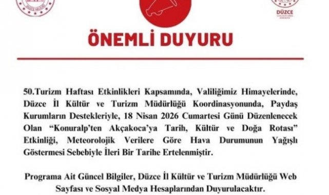 Tüm yurtta olduğu gibi Düzce'de 50. Turizm Haftası çeşitli etkinliklerle kutlanıyor. Düzce valiliği himayelerinde 18 Nisan 2026 Cumartesi günü düzenlenecek olan Konuralp'ten Akçakoca'ya tarih, kültür ve doğa rotası etkinliği, meteorolojik verilere göre hava durumunun yağışlı göstermesi sebebiyle ileri bir tarihe ertelendi.