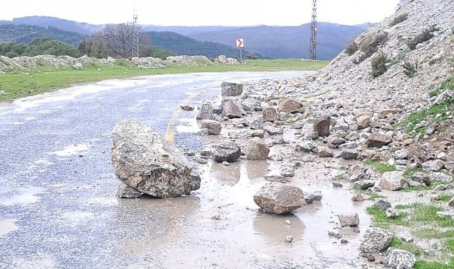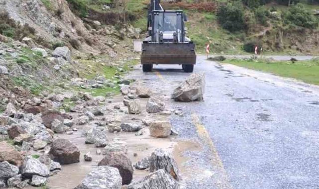 Aydın'ın Koçarlı ilçesinde etkili olan yağışlar sonrasında toprak kaymas meydana gelirken, düşen kaya parçaları yolu kapattı.