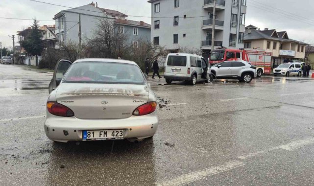 Kaza, Düzce Merkez'e bağlı Koçyazı Mahallesi 2221 Sokak'ta meydana geldi. Edinilen bilgiye göre, yağış nedeniyle kayganlaşan yolda, Şenol E.'nin kullandığı 81 FM 040 plakalı hafif ticari araç, yan yoldan ana yola çıkmaya çalışan Derya Ç. idaresindeki 81 FM 423 plakalı otomobile çarptı. Çarpışmanın etkisiyle savrulan hafif ticari araç, savrularak karşı yönde ilerleyen Birkan D. hakimiyetindeki 81 ADS 841 plakalı otomobile çarptı. Kazada otomobil sürücüsü Derya Ç. yaralandı. 112 Acil Çağrı Merkezi'ne yapılan ihbar üzerine olay yerine sağlık ve polis ekipleri sevk edildi. Yaralı sürücü, ilk müdahalesinin ardından Atatürk Devlet Hastanesine kaldırıldı.