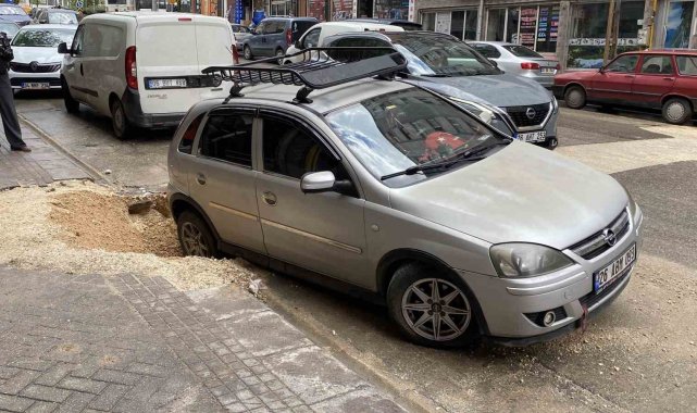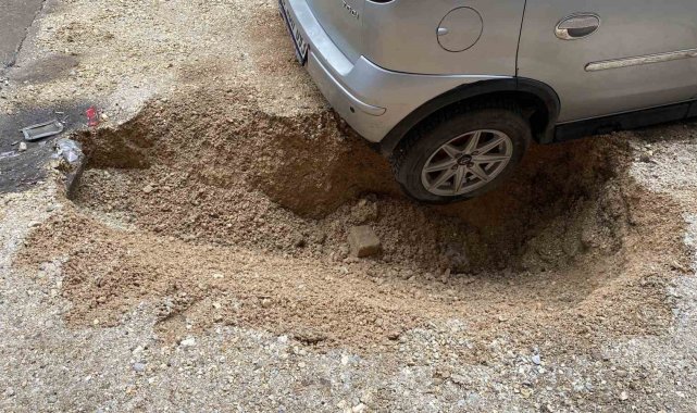 Yağışın etkisiyle çöken zeminde park halinde olan otomobil çukura düştü