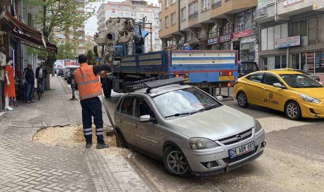 Eskişehir'de etkili olan yağışın etkisiyle çöken zeminin üzerinde park halinde olan ve sağ arka tekerleği çukura düşen otomobil çekici yardımıyla kurtarıldı.