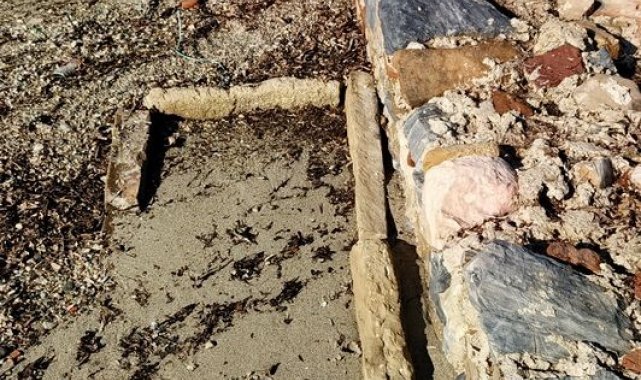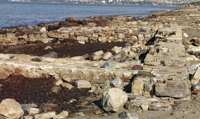 Aydın'ın Kuşadası ilçesinde sağanak yağış sonrası yaşanan sel sebebiyle, denize taşınan kıyı kumları tarihi gün yüzüne çıkarttı.