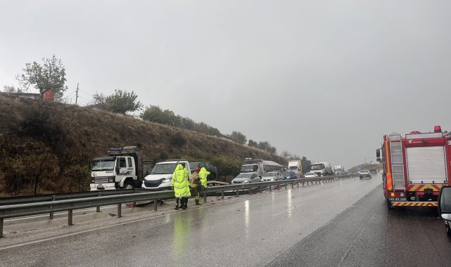 Manisa'nın Kula ilçesinde etkili olan yağışlı hava, trafik kazasını da beraberinde getirdi. Sürücüsünün kontrolünden çıkan tır makaslayarak yolu kapattı. Kaza nedeniyle İzmir-Ankara D300 karayolunun Uşak istikametine trafik bir süre sağlanamadı.