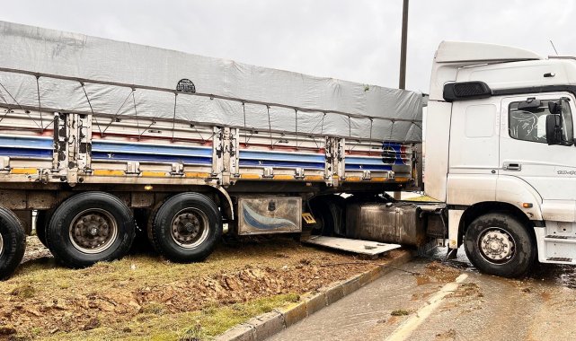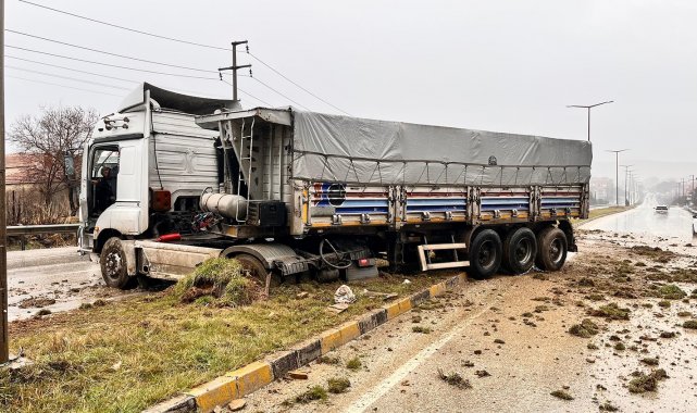 Manisa'nın Kula ilçesinde yağışlı havanın da etkisiyle kayganlaşan yolda sürücüsünün kontrolünden çıkan tır orta refüje çıkarken kazada sürücü yara almadı.