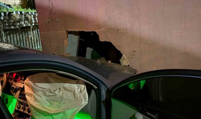 Yağışlı havada kontrolden çıkan otomobil depo duvarına çarptı