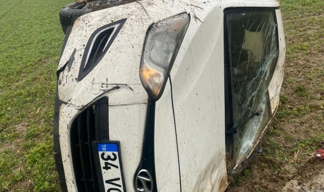 Kırklareli'nin Pınarhisar ilçesinde yağışlı havanın etkisiyle meydana gelen trafik kazasında, sürücüsünün kontrolünden çıkan otomobil tarlaya savruldu.