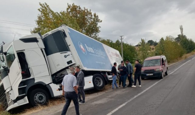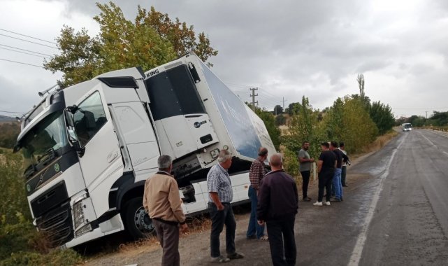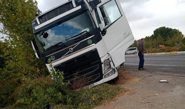 Yağışta yoldan çıkan tır şarampole girdi