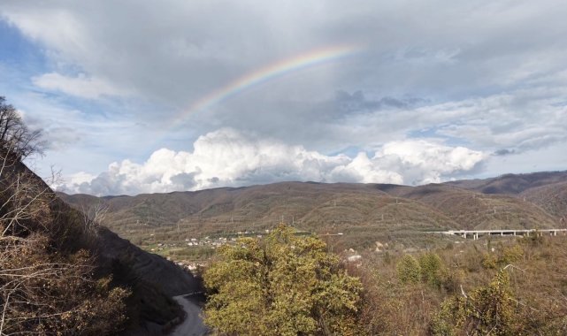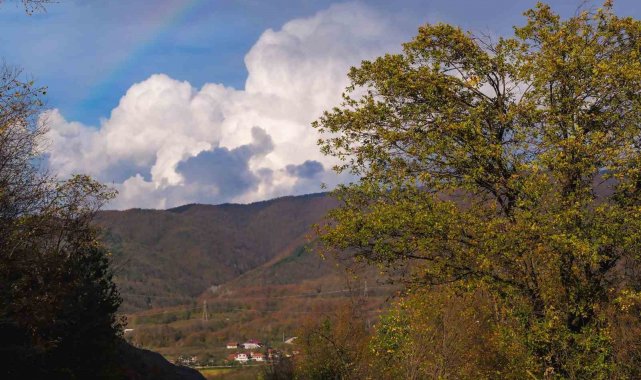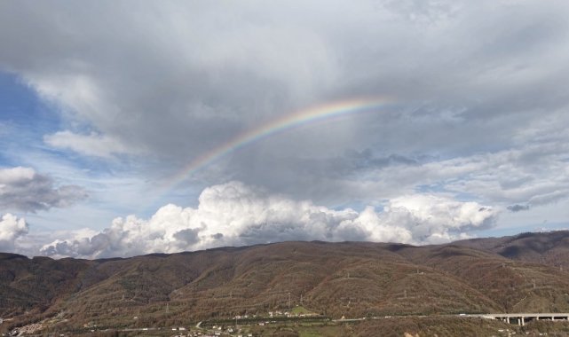 Düzce'de hafta sonu etkili olan sağanak yağışın ardından hafta başında açan güneş ile birlikte gökyüzünde gökkuşağı belirdi. Gökkuşağı havadan görüntülendi.