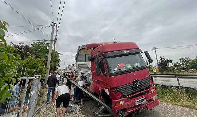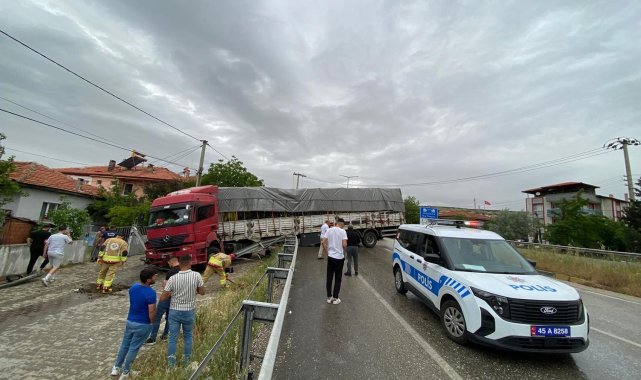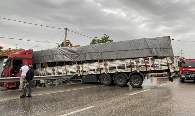 Manisa'nın Kula ilçesinde yağmurda kayganlaşan yolda kontrolden çıkan tır, bariyerlere çarptıktan sonra yan yola devrildi. Kazada sürücü yara almazken, araçta hasar meydana geldi.