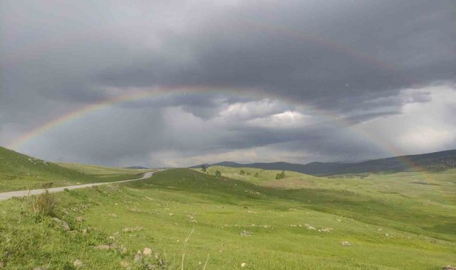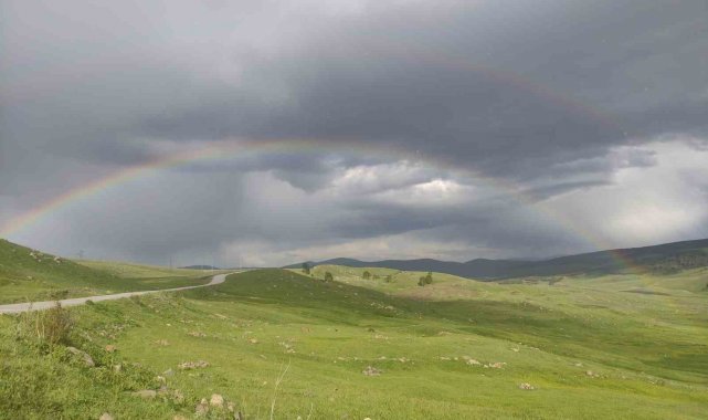 Ardahan'ın Göle ilçesine bağlı Kalecik köyünde sabah saatlerinde başlayan sağanak, kısa süreli etkili oldu. Yağmur bulutlarının bir anda dağılıp güneşin yüzünü göstermesiyle, gökkuşağı ortaya çıktı. Uzun süre gökyüzünde kalan gökkuşağı, köyün birçok noktasından da izlendi.