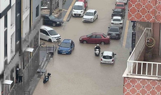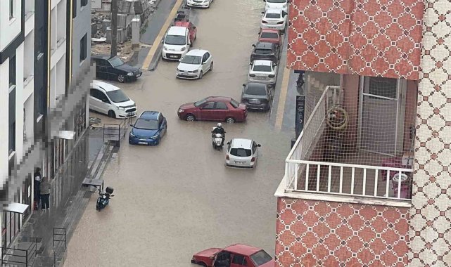Kentte aniden bastıran sağanak, hayatı olumsuz etkilerken, 13 Mart Mahallesi'nde yağmur suyu birikintisinde mahsur kalan motosiklet sürücüsü, ilerleyemeyince motosikletini bırakıp yanındaki otomobilin üzerine çıkıp karşıya geçerek canını kurtardı.
