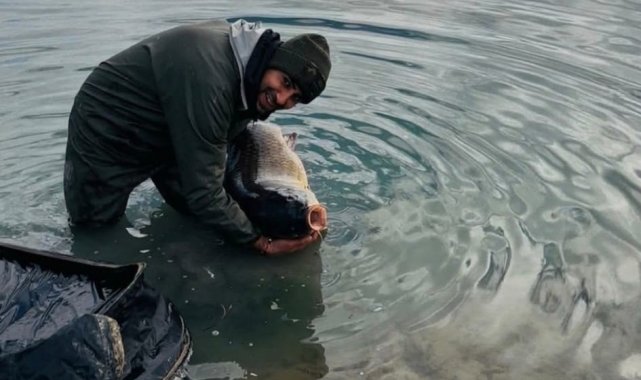 Yakaladıkları dev gibi sazan balığını suya geri bıraktılar