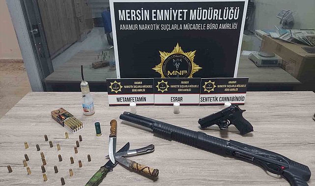 Alınan bilgiye göre, İl Emniyet Müdürlüğü Anamur Narkotik Suçlarla Mücadele Büro Amirliği ekipleri, uyuşturucu ile mücadele çerçevesinde çalışma yaptı. Anamur Cumhuriyet Başsavcılığı koordinesinde yapılan çalışmada belirlenen bir otomobildeki şüpheliler A.A. ile A.K. gözaltına alındı. Şüphelilerin otomobil ile evlerinde yapılan aramada çeşitli miktarlarda esrar, sentetik kannabinoid, metamfetamin, bong, 1'er adet tüfek ve tabanca ile çeşitli suç aletleri ele geçirildi.