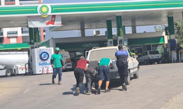 Yakıtı biten otomobili polis ve vatandaşlar iterek akaryakıt istasyonuna götürdü