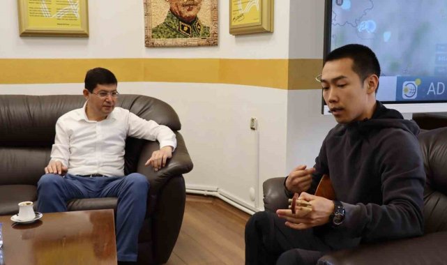 Yakutistan'dan dünya turuna çıkan ve 6 gün önce Türkiye'ye gelen 29 yaşındaki Aman Odun, Belediye Başkanı Kürşat Engin Özcan'a dombra şarkısını çaldı.