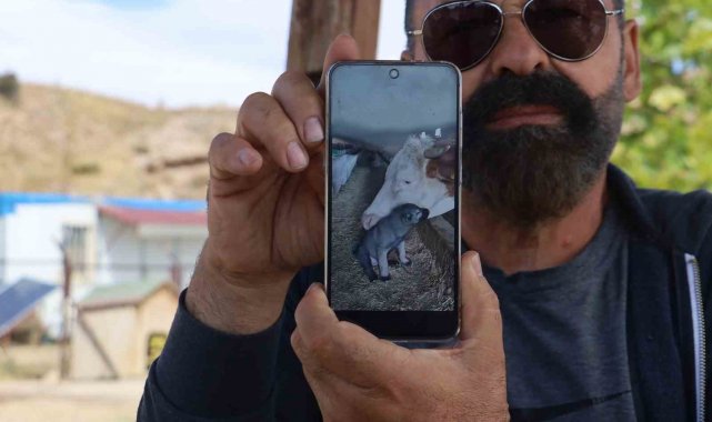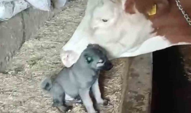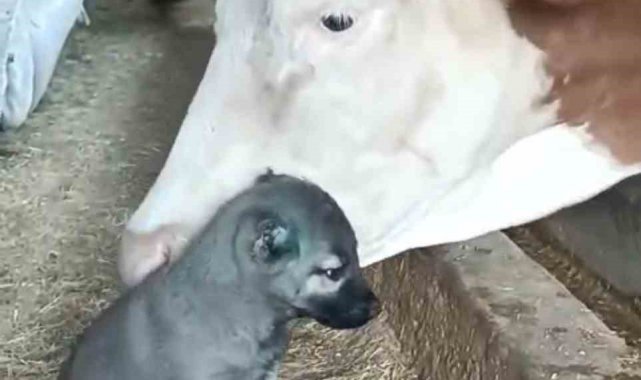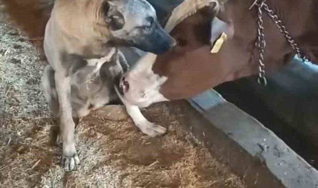 Sivas'ta 45 günlükken ilk aşıları yapılarak bir çiftliğe gönderilen yavru kangalı kendi yavrusu gibi sahiplenen inek, köpekle ilgilendi. Her gün ahıra giderek ineğin önüne oturan yavru kangal, aradan geçen 1 yıla rağmen alışkanlığından vazgeçmedi. İneğin kangal köpeği ile ilgilendiği anlar, cep telefonu kamerasına yansıdı. İnek ve kangal köpeğinin dostluğu görenleri gülümsetiyor.