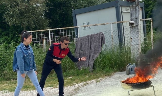 Eğitim alan katılımcılara KKT (Kuru Kimyevi Tozlu Tüp) kullanımı, yangın önleme, ilk müdahale, yangın çeşitleri ve çeşitlerine göre nasıl davranılması gerektiğine yönelik uygulamalı olarak anlatılıyor.