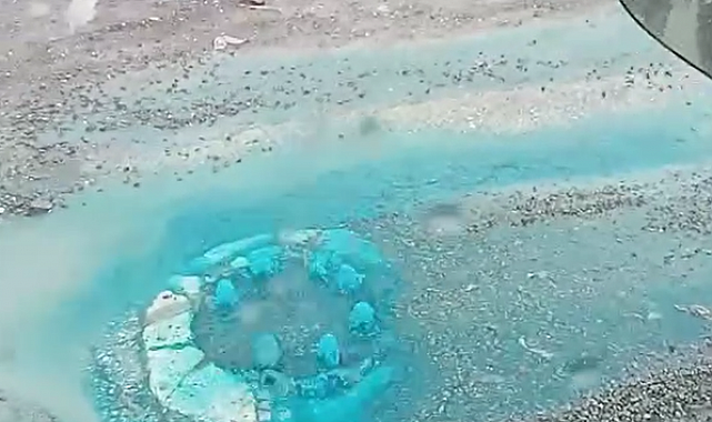 Yalova'nın Çiftlikköy ilçesine bağlı Taşköprü beldesinde rögardan taşan mavi renkli suyun ilk belirlemelere göre gıda boyasından kaynaklandığı tespit edildi.