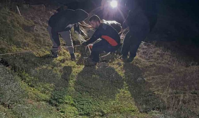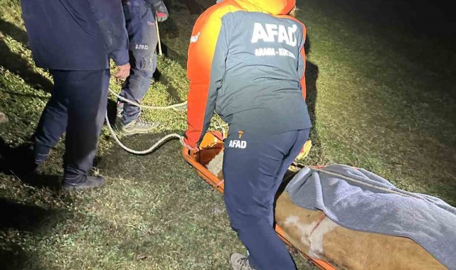 Artvin'in Şavşat ilçesinde merada otlarken yamaçtan düşen bir inek, AFAD ekiplerinin 12 saat süren çalışmasıyla kurtarıldı.