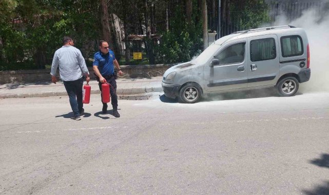 Afyonkarahisar'ın Şuhut İlçe Emniyet Müdürlüğü binasının önünde bir anda alev alan araç polislerin yangın tüpleri ile yaptığı müdahale sonrası söndürüldü.