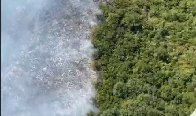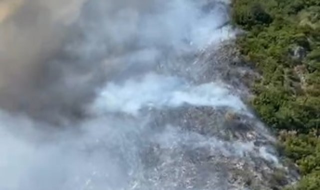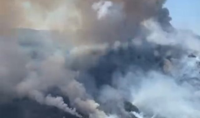 Yangın söndürme çalışmalarında görev alan helikopterden çekilen görüntülerde, yanan alanlar yoğun şekilde gözler önüne serildi.