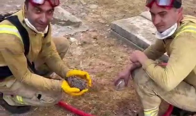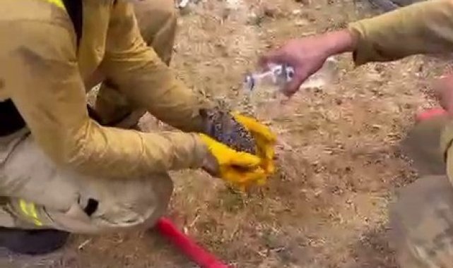 Çanakkale'de Merkez ve Bayramiç ilçelerinde öğle saatlerinde başlayan yangınlara müdahale devam ediyor. Orman yangınlarından hayvanlar da olumsuz etkileniyor. Merkez ilçeye bağlı Sarıcaeli köyünde orman işçileri yangından etkilenen bir kirpiyi kurtardı. Dumandan ve sıcak havadan etkilenen kirpiye orman işçileri su içirerek serinletti.