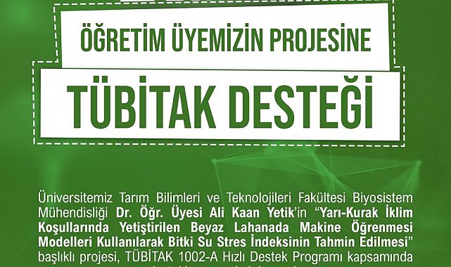 Niğde Ömer Halisdemir Üniversitesi Tarım Bilimleri ve Teknolojileri Fakültesi Biyosistem Mühendisliği Bölümü öğretim üyesi Dr. Ali Kaan Yetik'in "Yarı-Kurak İklim Şartlarında Yetiştirilen Beyaz Lahanada Makine Öğrenmesi Modelleri Kullanılarak Bitki Su Stres İndeksinin Tahmin Edilmesi" başlıklı projesi, TÜBİTAK 1002-A Hızlı Destek Programı kapsamında desteklenmeye hak kazandı.