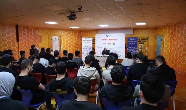 Düzce Fen ve Teknoloji Hafız Anadolu İmam Hatip Lisesi'nde yoğun katılımla düzenlenen etkinlikte, Mühendislik Fakültesi Dekanı ve Düzce Teknopark Müdürü Prof. Dr. Resul Kara, yapay zekanın günümüz dünyasındaki yeri, çalışma prensipleri ve geleceğe etkilerini ele aldı.