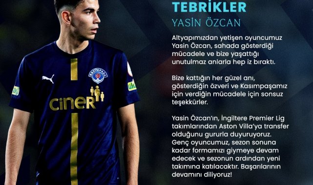İngiltere Premier temsilcisi Aston Villa, milli futbolcu Yasin Özcan'ı kadrosuna kattığını açıkladı. Trendyol Süper Lig ekiplerinden Kasımpaşa'da gösterdiği performansla dikkatleri üzerine çeken Özcan, sezonun geri kalanını lacivert-beyazlılarda tamamlayacak. 18 yaşındaki futbolcu, sezon sonu İngiltere ekibine dahil olacak. Konuyla ilgili Kasımpaşa kulübünün sosyal medya hesabından yapılan açıklamada, "Altyapımızdan yetişen oyuncumuz Yasin Özcan, sahada gösterdiği mücadele ve bize yaşattığı unutulmaz anlarla hep iz bıraktı. Bize kattığın her güzel anı, gösterdiğin özveri ve Kasımpaşamız için verdiğin mücadele için sonsuz teşekkürler. Yasin Özcan'ın, İngiltere Premier Lig takımlarından Aston Villa'ya transfer olduğunu gururla duyuruyoruz. Genç oyuncumuz, sezon sonuna kadar formamızı giymeye devam edecek ve sezonun ardından yeni takımına katılacaktır. Başarılarının devamını diliyoruz" ifadelerine yer verildi.