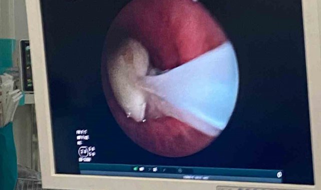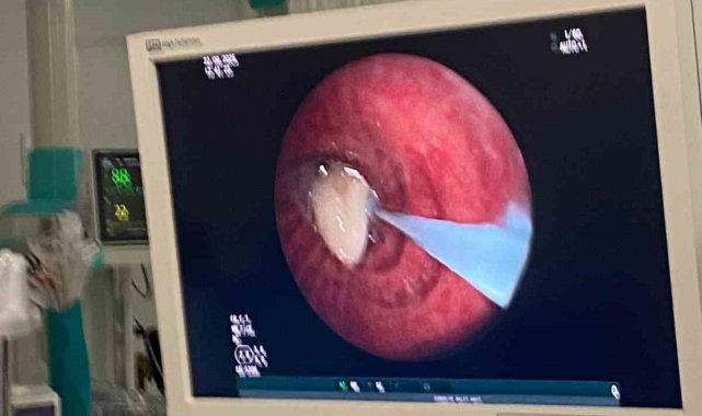 Hastanın genel anesteziye gerek duyulmadan normalde böbrek taşlarının çıkarılmasında kullanılan üreter kateteri basketi ile yabancı cismin akciğerden çıkarıldığını söyleyen Dr. Hüsamettin Sazlıdere, "Hastanemize nefes darlığı ve morarma şikayetiyle başvuran hastanın tomografisinde sol alt lobda tıkanıklık görüldü. Fleksibl bronkoskopi ile yapılan incelemede sol ana bronş distalinde yabancı cisim saptandı. Bu cisim üreter kateteri basketiyle başarılı şekilde çıkartıldı. Hastamız sağlığına kavuştu" dedi.