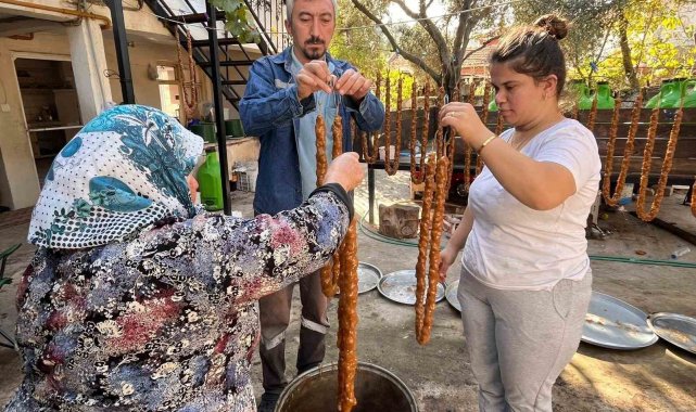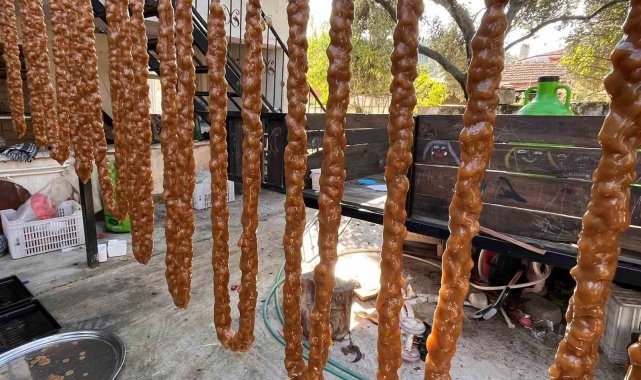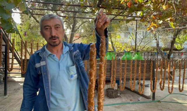 Muğla'nın Yatağan ilçesi Şahinler Mahallesi'nden Servet Çıldır, tamamen doğal ürünlerle yaptığı cevizli sucukla hem damaklara hem de sağlığa hitap ediyor.