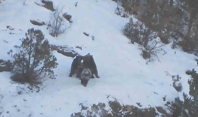 Doğa Koruma ve Milli Parklar (DKMP) Genel Müdürlüğünün sosyal medya hesaplarından yayınlanan ve büyük ilgi gören görüntülerde anne ayının yavrularıyla birlikte karla kaplı ormanda yuvarlanarak oyun oynadığı anlar yer aldı.