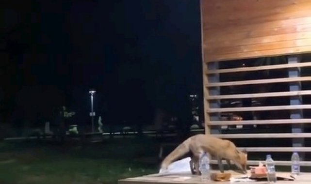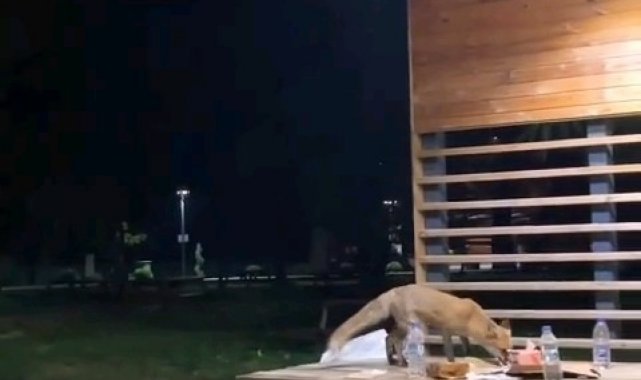 Tilkinin pastayı yemeye çalıştığı anlar, cep telefonu kamerasıyla saniye saniye kaydedildi. Görüntülerde tilkinin masaya çıkıp pastayı kokladığı, ardından etraftakileri fark edince hızla kaçtığı görüldü.