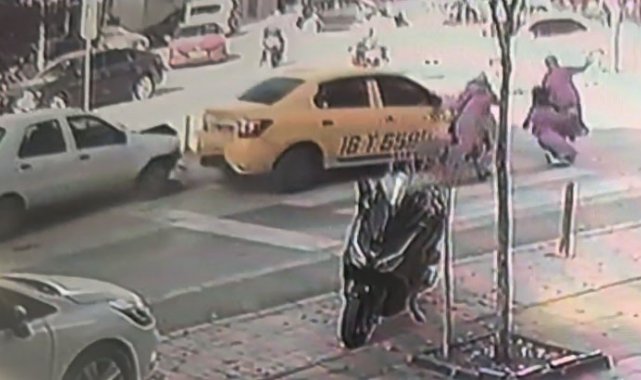 Bursa'nın İnegöl ilçesinde yaya anne ve bebeğine yol veren taksiye arkadan gelen otomobil çarptı. Çarpmanın etkisiyle taksi de anne ve bebeğine çarptı. Yaşanan o korku dolu onlar saniye saniye güvenlik kameralarına yansıdı.