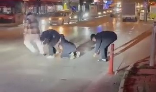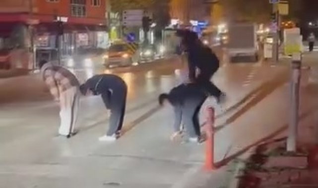 Bursa'da dört genç caddenin karşısına birdirbir oynayarak geçti. O anlar cep telefonu kamerasına yansıdı.
